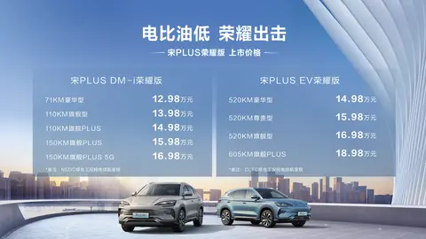 近日,比亚迪的热度可谓出奇的高,唐汉DM-i荣耀版的发布已经够博人眼球了,紧跟着宋PLUS 的荣耀版也来了!这次EV版和DM-i版一共推出的九款车型,宋PLUS EV荣耀版售价区间在14.98-18.98万之间,宋PLUS DM(图片|配置|询价)-i荣耀版售价区间在12.98万-16.98万之间。相比于2023的冠军版,2024荣耀版在价格下调的同时,配置也进行升级优化,有了更高的性价比。