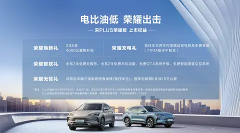 同时官方还给到了购买权益:自上市之日至3月31日24:00前完成购车开票,购买宋PLUS荣耀版可享2年0息、4000元置换补贴、首任车主三点系统终身保修(非运营)、整车保修六年或15万公里、两年内免费赠从安装充电桩(71KM版本不包含)、全系2年免费云服务、免费OTA系统升级等多重优惠。