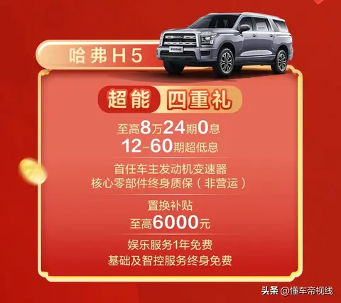 在活动期间购买哈弗H5可享至高6000元置换补贴;至高8万元24期0息、12-60期超低息;首任车主发动机、变速箱核心零部件终身质保;基础及智控服务终身免费,娱乐服务1年免费。