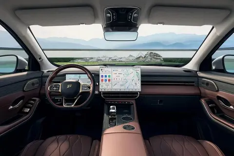 进入车内,内饰的整体布局风格较为简约,配备了10.25英寸全液晶仪表,15.6英寸的悬浮式中控屏和三幅式多功能方向盘,并采用了水晶档把,提升了车内的豪华感。