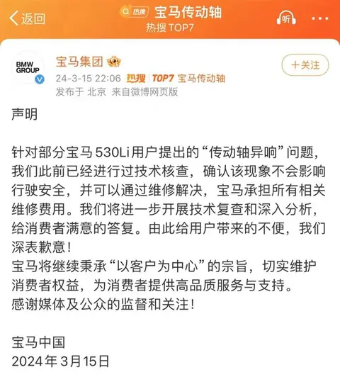 很明显,宝马面对这一事件,并没有诚意。对于央视报道中提到的“出问题的车型依旧在大力地推广销售中”,宝马在“声明”中则只字未提。要知道,宝马部分车型存在“传动轴异响”问题,早在2023年下半年就开始发酵,近一年的时间都没有解决,宝马官方明显存在态度问题。