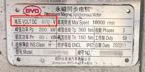 需要注意的是(2),这组670伏电压如果是额定值,意味着峰值电压可以超过750伏或更高;如果为峰值,其额定值大概率为580-600伏左右,与刀片电池额定电压588.8伏,统一设定在600伏级。