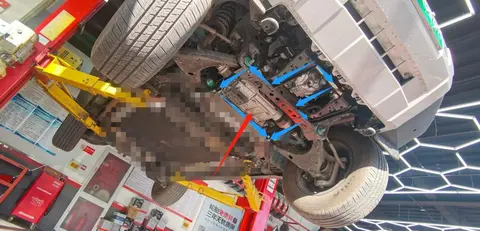 在此前《研判:方程豹豹5混动越野车车型平台技术优势!》内容中,方程豹豹5的前后副车架、中置刀片电池下护板被拆解,可以清晰看到前纵置DMO混动模块(蓝色区域)的铭牌(红色箭头所指)信息。