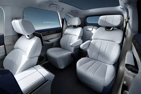 内饰方面,远航H8车内看起来豪华舒适,中控台采用一体式布局设计,12.3英寸仪表屏采用悬浮式造型,17.38英寸中控屏则采用大尺寸竖屏风格设计,空调出风口采用隐藏式设计,由主驾台延伸至副驾驶台,这样的设计提升了车内的档次感,同时实用性也比较强。此外,中控台、门板以及座椅等区域均采用同一配色,加入了大量的软皮材质包覆。采用6座2+2+2座椅布局,采用Nappa真皮座椅设计,第一排和第二排座椅支持电动调节、腿托、座椅加热、通风、按摩和记忆功能。