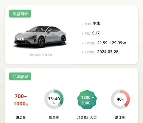 就在各方为此唇枪舌剑、争得不可开交之时,某知名汽车博主发布了一份《小米SU7(图片|配置|询价)·72小时新车上市一线快报》,其中明确列出:该车彼时的“锁单率”约为35-40%,退订率则为40%。