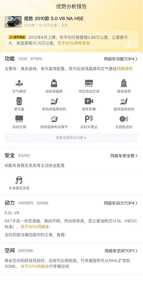 我们今天要讲的这款揽胜的具体版本为2010款5.0 V8 NA HSE,属于中大型SUV类别。该车的外观采用黑色设计,首次注册时间为2010年6月,并在北京地区首次上牌,至今已行驶了12.10万公里。值得一提的是,该车仅转过一次户,目前的牌照所在地及售卖地点均为北京。新车在2010年的售价高达172.8万元,但如今二手车行情却仅为25万元,与新车相比便宜了147.8万元。