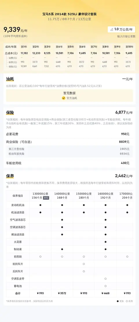关于车辆的使用成本部分,既然聊到这个话题,那就不得不提一下这台车的用车成本。我们统计了该车的保险费用、平均能耗等信息,帮您从另一个角度了解这台车的真实使用情况。