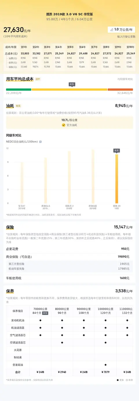 购买二手车不仅要考虑购车成本,也要考虑日后的使用开销。根据估算,这辆车的年均综合用车成本约2.8万元左右,当然具体还是要根据车主的实际使用情况来决定的。