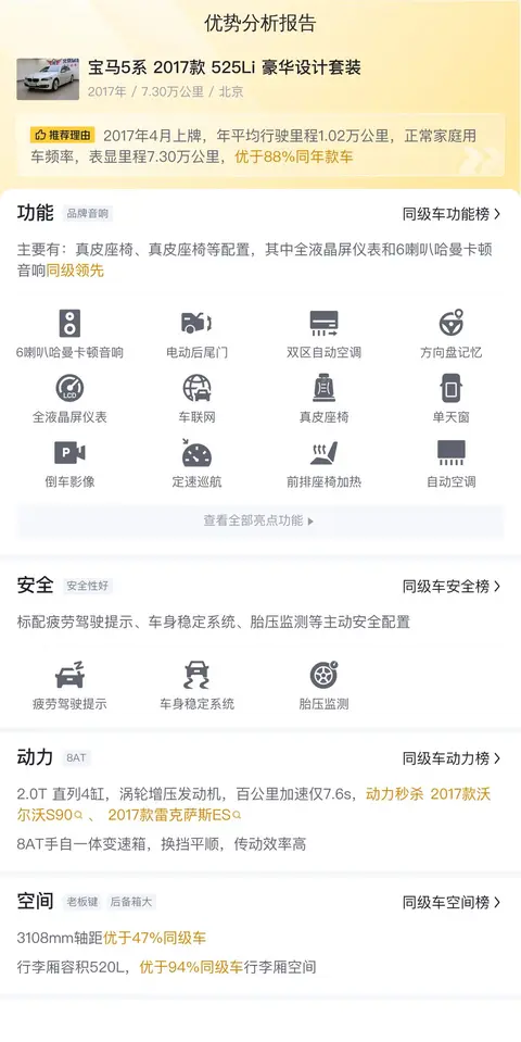 该车的具体版本为2017款525Li豪华设计套装,属于中大型轿车类别,白色外观,上牌日期为2017年4月,表显里程为7.30万公里,国五排放标准,目前在北京地区出售。该车的新车指导价为46.96万元,当前二手车报价为18.98万元,相比新车省下了30.98万元,有过2次过户记录。