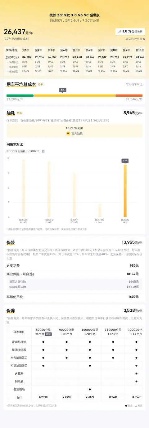 关于用车成本,根据我们估算,这辆车的年均综合用车成本约在2.6万元左右。不过具体花费金额还是需要根据车辆的实际使用情况来进行判定的,毕竟每台车的使用场景和方式都不太一样,所以此部分开销也会有所差异。