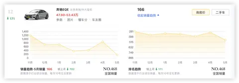 同级的竞争对手,奔驰的EQE销售表现还要更差一些。5月份销量只有166辆。