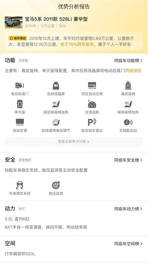 今天我们将为您带来一款二手宝马5系(图片|配置|询价),该车的具体版本为2011款的528Li豪华版。这款车型于2010年12月首次上牌,至今已跑了12万公里。相比新车指导价52.56万元,目前二手车商报价仅为10.88万元。需要注意的是,此车的牌照所在地和售卖地点均为深圳,同时还是国IV排放标准,因此在购买时需注意相关地区对车辆排放的要求。