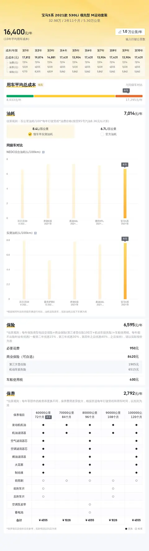 关于用车成本,根据我们的估算,这辆车的年均综合用车成本大约为1.6万元左右。当然,这个费用会根据您的实际使用情况有所不同。为了让您更好地了解这款车与同类车型在燃油效率和维修保养成本方面的表现,我们进行了细致的分析。