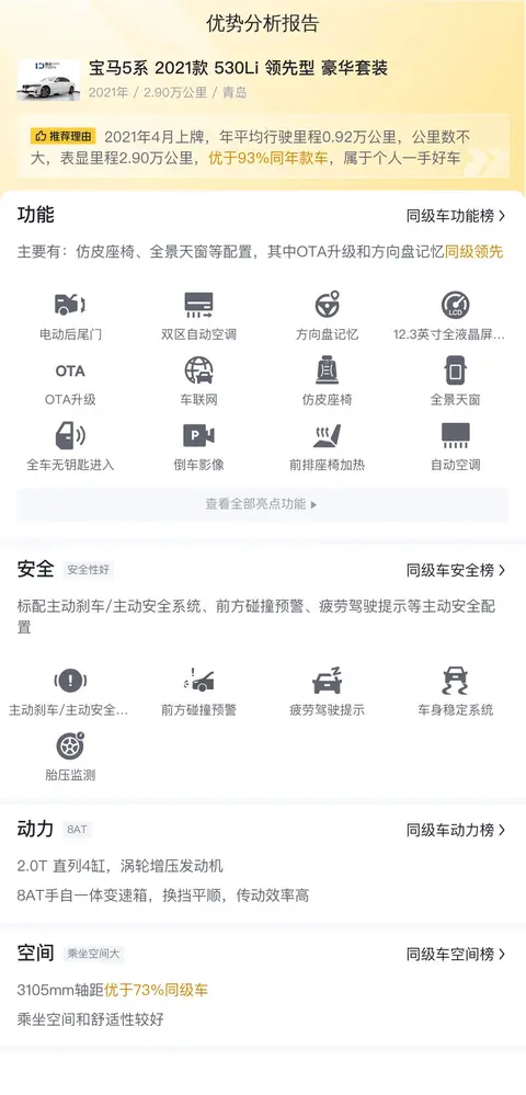 今天我们将为您带来一款备受关注的二手好车——宝马5系(图片|配置|询价) 2021款 530Li 领先型豪华套装,该车于2021年4月首次上牌,至今仅跑了约2.9万公里。相比新车指导价46.69万,如今二手车商报价仅为30.78万,要知道这可是一台零过户的车。车辆位于并牌照于青岛,车身颜色为白色。如果您对这款车感兴趣,我们将在文末提供看车方式。