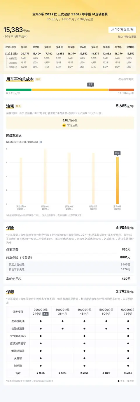在用车成本方面,根据估算,这辆车年均综合用车成本大概在每年1.5万元左右。需要注意的是,具体的用车金额根据车辆使用强度及使用环境的不同,会有较大的变化。