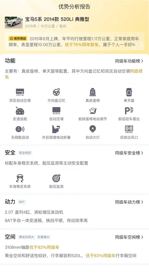 通过对比同价位的二手车,我们对本车在动力性能、安全配置、车内空间等方面进行了评估,并整理出了一份报告,旨在让您更直观的了解本车的优势所在。