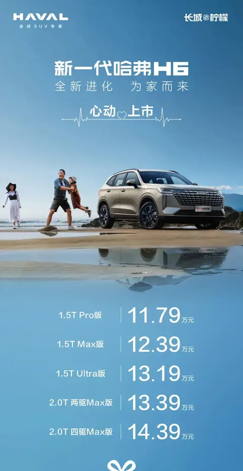 4月19日,长城汽车正式公布全新哈弗H6(图片|配置|询价)售价,新车共推出5款车型,售价区间为11.79-14.39万元。据了解,这是哈弗H6自诞生以上第四次换代,新一代哈弗H6基于长城柠檬平台打造,采用全新的外观和内饰设计。作为参考,目前在售哈弗H6包含第三代、第二代国潮版等车型,售价区间为9.89-14.98万元。