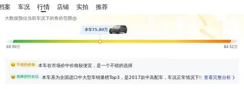 在市场行情部分,目前这款车的二手车行情大致在69.90万至84.52万之间。当然,这些数据只能提供一个大体的市场价值区间,实际成交价格会依据车辆年份、里程及维护状况等关键因素有所变动。
