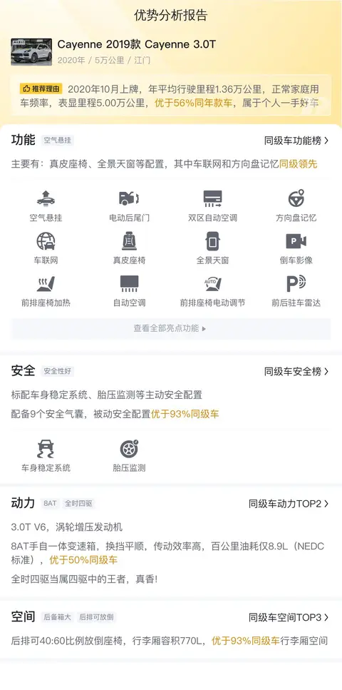 车况信息:本文介绍的是一辆2019款保时捷卡宴,具体版本为Cayenne(图片|配置|询价) 2019款 Cayenne 3.0T。该车上牌日期为2020年10月,至今已跑了5万公里,目前处于0过户的状态。新车指导价为91.30万,而现在的二手报价为63.80万。该车的车源所在地和牌照所在地均为——广东江门。