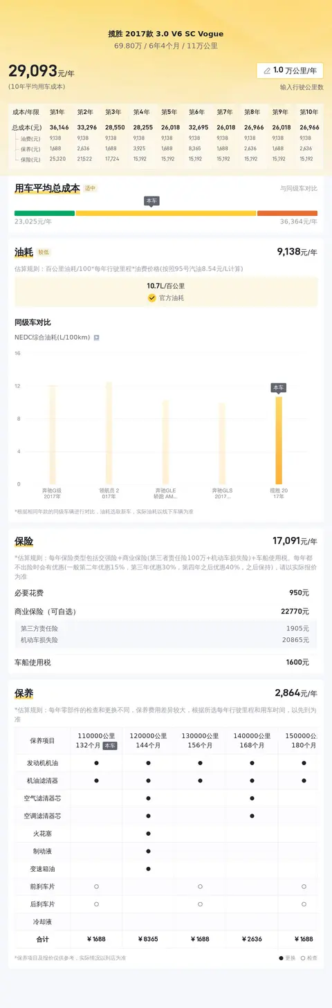 对于二手车来说,用车成本是不可忽视的一部分。据估算,这辆车的年均综合用车成本约2.9万元左右。当然,具体的花费金额还是取决于车主的实际使用情况和保养习惯。