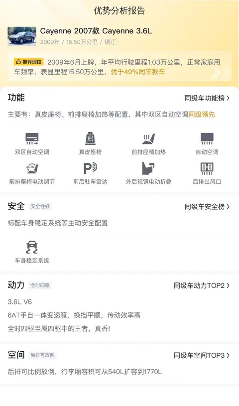 本次要说的是一款保时捷Cayenne(图片|配置|询价),具体版本为Cayenne 2007款 Cayenne 3.6L。该车定位中大型SUV,截止目前表显里程为15.50万公里,首次上牌时间为2009年06月,国IV排放标准,目前车源所在地及上牌地均为江苏镇江,有过2次过户记录。新车指导价91.8万,目前二手车报价5.68万,相比新车便宜了83万多。