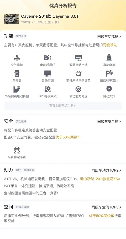欢迎各位车友们,今天我们将为大家带来一款备受瞩目的豪华轿车——保时捷Cayenne(图片|配置|询价),特别的是我们为您准备了一台二手版本。让我们一起探讨一下这款二手车的综合性能,看看它是否值得您的青睐。首先,让我们快速了解一下该车的基本信息:该车的具体版本为Cayenne 2011款 Cayenne 3.0T,是一款中大型SUV,白色外观,2012年7月首次上牌,表显里程为18.30万公里,目前悬挂国IV牌照。最初的新车指导价为92.2万,而现在仅需13.60万便可拥有。值得一提的是,该车已转过2次手了,目前所在地与牌照所在地均为河南濮阳。
