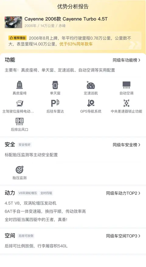 当前市场上类似这款Cayenne的二手车型并不少见,价格差异主要由车龄、里程和维护状况等因素造成。目前这款车的二手车行情大致在6.57万至8.46万之间。