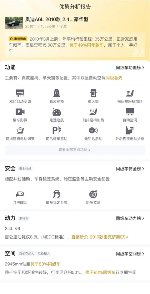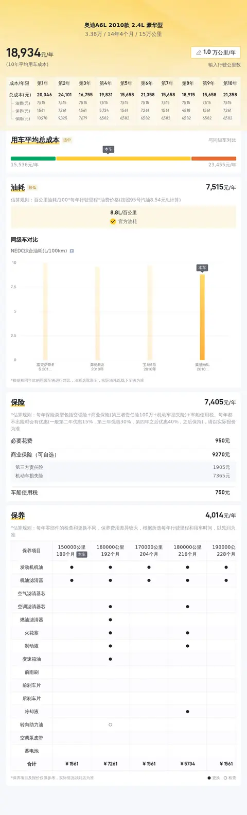 在日常使用成本方面,经过估算,这辆A6L的年均综合用车成本大约为1.9万元。当然,这个金额会根据您的实际使用情况有所浮动。