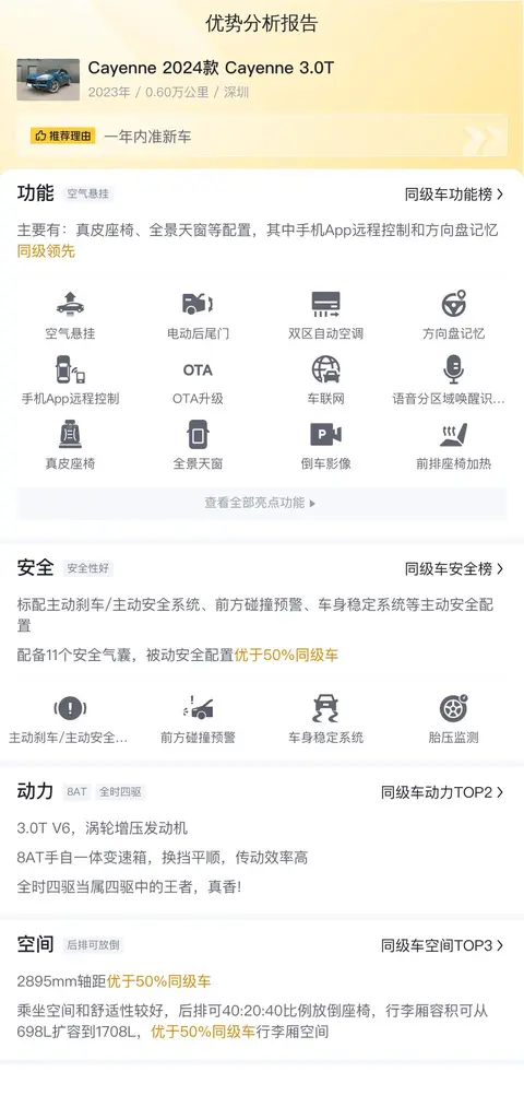 此车具体版本为2024款Cayenne 3.0T,于2023年11月首次上牌,至今已行驶约0.60万公里。该车在深圳地区出售,属于蓝牌车,并且只转过一次手。该车新车指导价约为98.80万,而如今二手车报价为95.80万。这样的价位反映了其高端定位和对应品质保证。