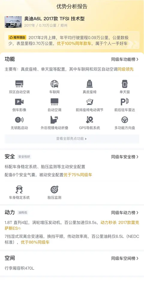 奥迪A6L(图片|配置|询价)自诞生以来就以其豪华感与科技感吸引了无数消费者的目光。它不仅是商务人士出行的首选,也是许多家庭追求高品质生活的象征。今天我们就为您带来一款二手奥迪A6L——2017款TFSI技术型。该车的具体版本为“奥迪A6L 2017款 TFSI 技术型”,上牌日期为2017年2月,表显里程仅为0.70万公里,车况保持良好。这款车型的初始指导价为41.29万,而现在仅需19.90万,相比新车指导价便宜了21.98万。该车目前在售于天津地区,牌照所在地同样位于天津,至今未有过任何过户记录。如果您对这款车感兴趣,可以考虑亲自看看。