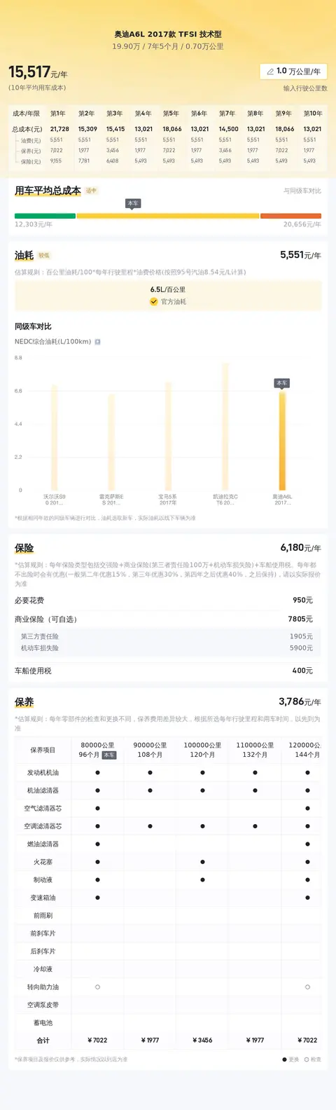 二手车购买时,除了关注价格外,日后的养护费用也是必不可少的一部分。据估算,这辆车的年均综合用车成本大约为1.6万元左右。当然,这个金额还会因个人使用强度和习惯而有所差异。