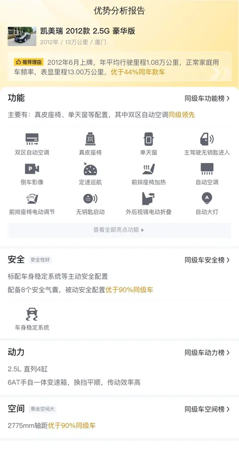 优势分析,凯美瑞 2012款 2.5G 豪华版的配置、空间及安全方面的表现均优于同级车,且保值率较高,属于比较值得入手的一款车型。