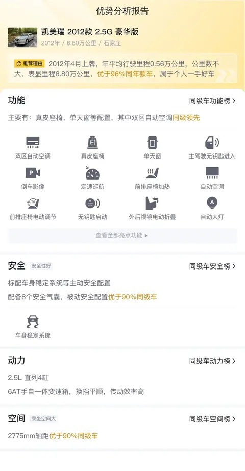 总结与建议:凯美瑞2012款2.5G豪华版是一款性价比较高的中型轿车,适合家庭代步或商务出行。然而,在购买时需注意车辆的保养状况和里程数,以确保其良好的性能和使用寿命。