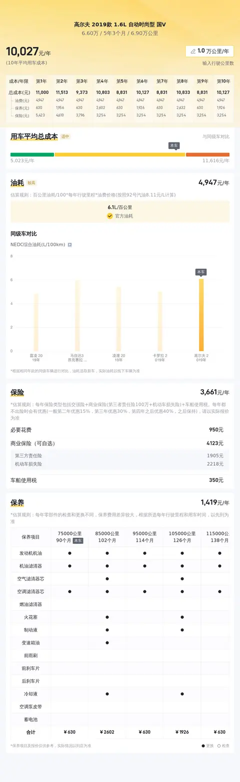 市场行情方面,当前这款高尔夫的二手车行情大致在6.36万至7.87万之间。用车成本方面,根据估算,这辆车年均综合用车成本大概在每年1.0万元左右。当然,这些数据仅供参考,实际用车成本会因个人使用习惯和维护情况而有所不同。
