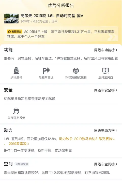 这款高尔夫的具体版本为——高尔夫 2019款 1.6L 自动时尚型 国V,属于紧凑型轿车,定位适合作为家庭代步工具。它的车身颜色为白色,上牌地为绍兴,上牌日期为2019年4月,至今0过户。新车指导价为13.12万,而现在的二手车报价仅为6.60万,相比新车价格优惠了6.52万。