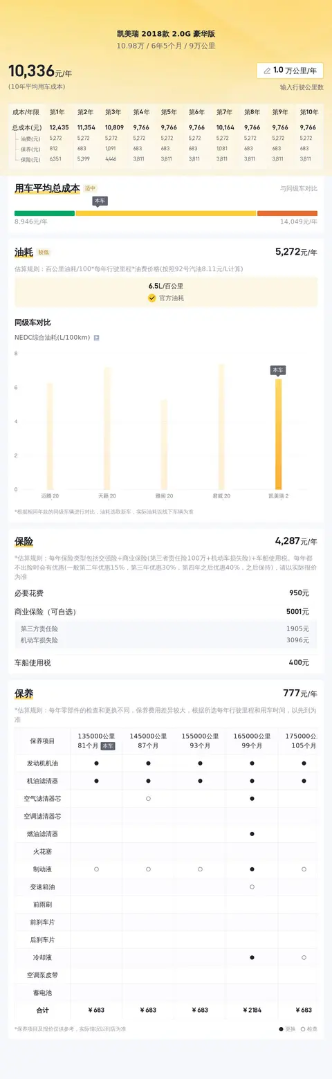 市场行情也是决定这辆车价值的重要因素。目前这款凯美瑞 2018款 2.0G 豪华版的二手车行情大致在8.48万至10.25万之间。当然,具体的售价会受到车龄、里程以及保养状况等因素的影响。根据估算,这辆车的年均综合用车成本大概在每年1万元左右,这一数字与同级车相比处于较低的水平。