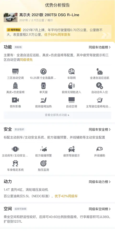 这辆高尔夫的具体版本是——2021款 280TSI DSG R-Line,定位为紧凑型轿车,车身颜色为白色,上牌地及车源所在地均在喀什。截至2024年7月,该车已行驶了2.11万公里,上牌日期为2021年7月,有过1次过户记录。新车指导价为16.58万元,而当前的二手车报价为11.11万元,相较新车价格优惠了5.47万元。