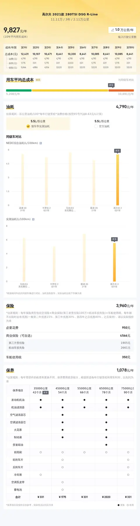 用车成本方面,根据估算,这辆车年均综合用车成本大概在每年1.0万元左右。这一数据为潜在买家提供了对持有成本的初步了解,但实际费用可能因个人驾驶习惯和维护情况而异。