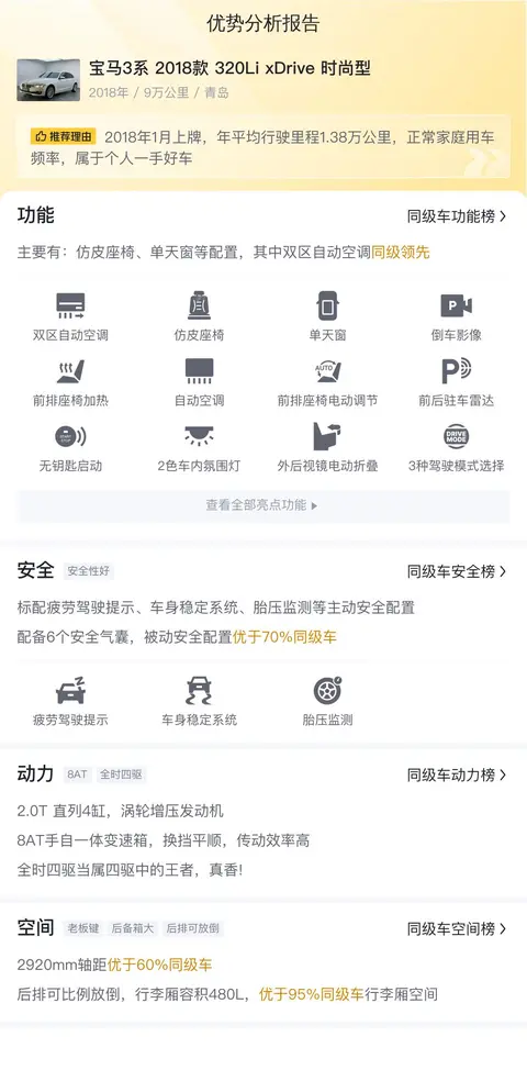 先来了解一下这辆车的基本车况信息,该车的具体版本是——宝马3系 2018款 320Li xDrive 时尚型,上牌日期为2018年1月,表显里程9万公里,新车指导价34.68万,二手车报价14.50万,0过户,车源所在地和上牌地均为青岛。