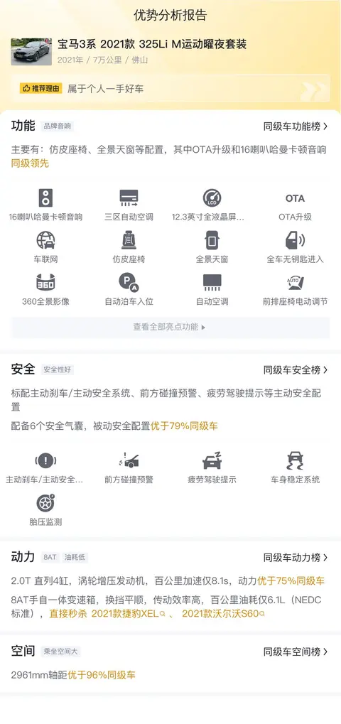 这辆车的具体版本是——宝马3系2021款 325Li M运动曜夜套装,定位于中型轿车,外观颜色为黑色,内饰是深色配色。2021年4月首次上牌,至今行驶了7万公里,车源地和上牌地都是佛山。这车新车含税价为40.30万,二手车报价20.88万。