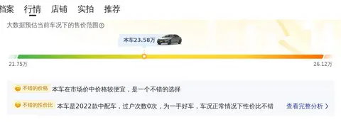 根据大数据预估显示,这款车的二手车行情大致在21.75万至26.12万之间,当前的23.58万报价处于合理区间内。同时,年均综合用车成本约1.4万元,这一数值会根据车辆具体情况而有所变化。