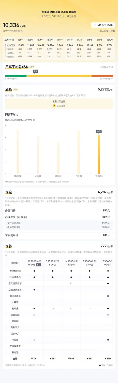 目前这款凯美瑞的二手车行情大致在10.78万元至12.43万元之间,而该车的报价仅为9.6万元,性价比较高。用车成本方面,根据估算,这辆车年均综合用车成本大概在每年1.0万元左右。