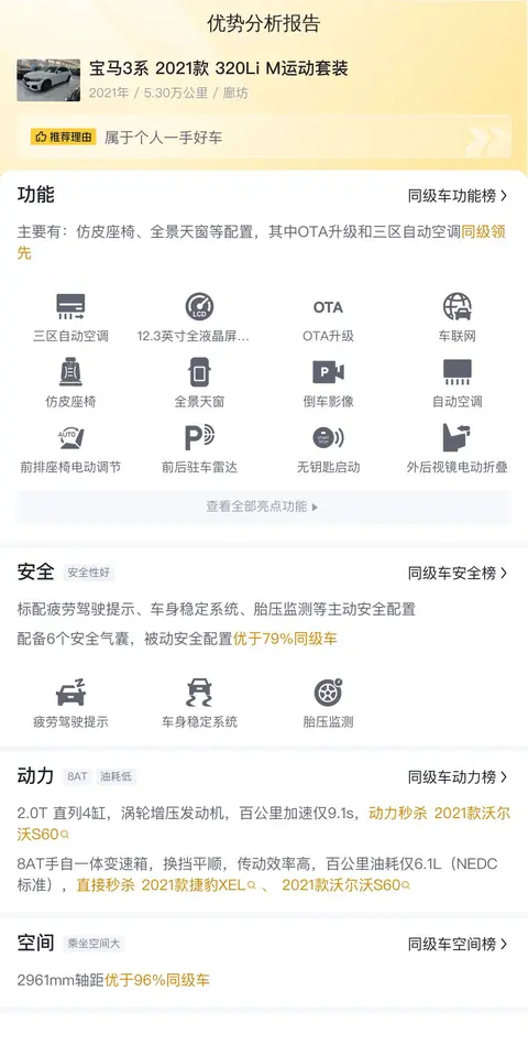 优势分析方面,通过分析宝马3系 2021款 320Li M运动套装与同级车在安全、动力、空间、功能配置等方面的对比,我们可以发现它的整体表现优于66%的同级车。这一成绩证明了它在市场上的竞争力。