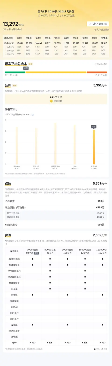 目前,这款宝马3系 2018款 320Li 时尚型的二手车行情大致在14.29万至16.97万之间,而本文介绍的这款二手车报价仅为12.66万元,性价比较高。用车成本方面,根据估算,这辆车年均综合用车成本大概在每年1.3万元左右。