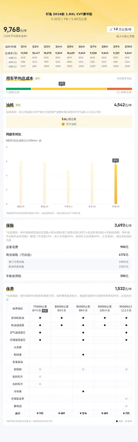 目前的二手车市场中,轩逸 2016款 1.6XL CVT豪华版的行情大致在4.87万至6.08万之间。具体的价格因车况而异。用车成本方面,按一年行驶一万公里计算,包括保险、保养和燃油费用在内,平均每年约1万元,与同级车相比处于较低水平。