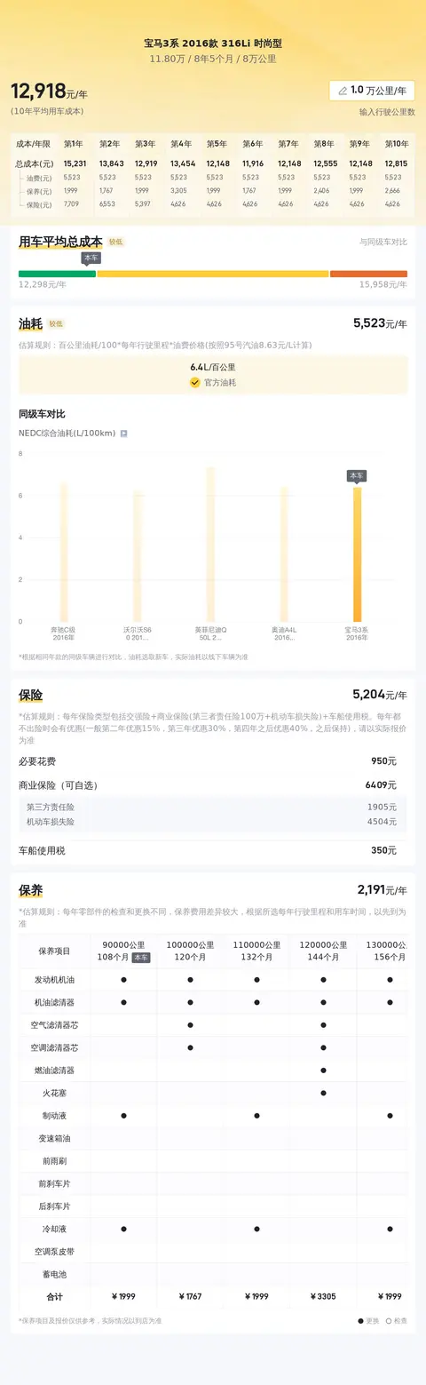 在用车成本方面,根据估算,这辆车年均综合用车成本大概在每年1.3万元左右。这里要说的是,用车成本跟车主的使用环境和驾驶习惯有着直接关系,所以仅供参考。