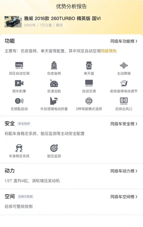 在同级别车型中,这款雅阁 2018款 260TURBO 精英版 国VI在空间、动力、安全配置等方面表现出色。它拥有宽敞的内部空间,无论是前排还是后排乘客都能享受到舒适的乘坐体验。动力方面,搭载的1.5T涡轮增压发动机提供了充沛的动力输出,同时燃油经济性也得到了很好的平衡。安全配置方面,该车配备了多项主动和被动安全系统,为驾乘人员提供全方位的安全保障。