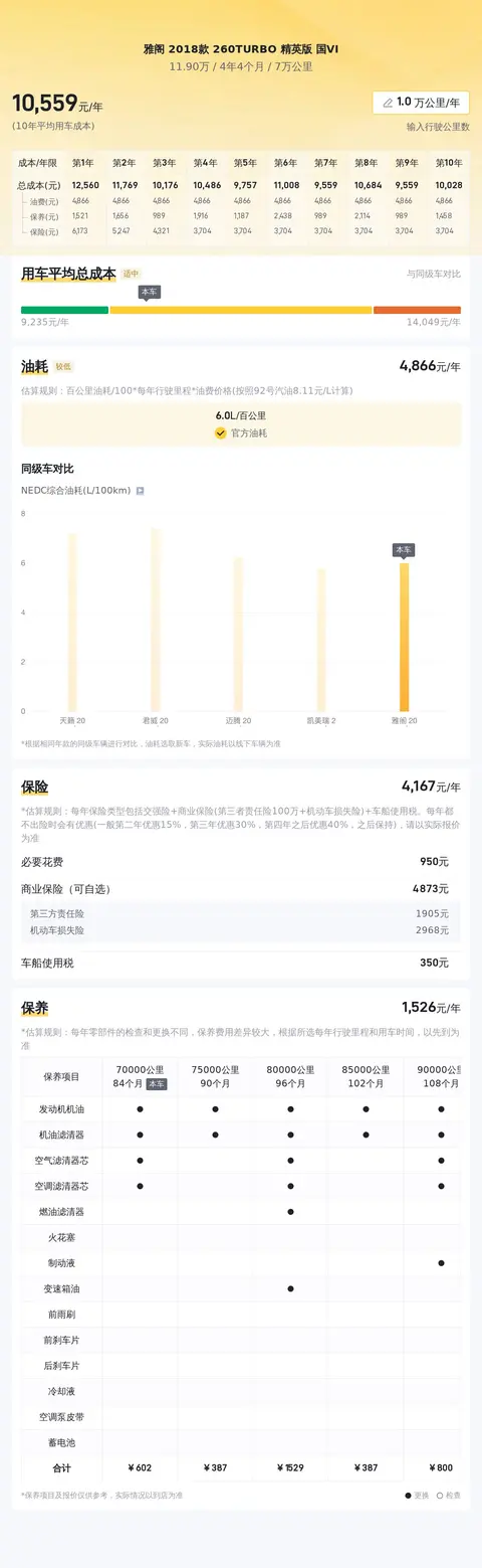 目前市场上类似车况的雅阁 2018款 260TURBO 精英版 国VI二手车价格大约在10.1万至11.9万之间。当然,具体价格会受到车辆状况、行驶里程等因素的影响。在用车成本方面,根据估算,这款车的年均综合用车成本约为1.1万元左右,具体费用会根据个人使用习惯和维护情况有所不同。