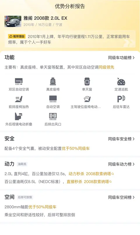 优势分析方面,通过懂车帝网站大数据的统计,这款雅阁 2008款 2.0L EX在安全、动力、空间等方面均优于50%的同级车,这也从侧面证明了这款车的性价比和实用性。