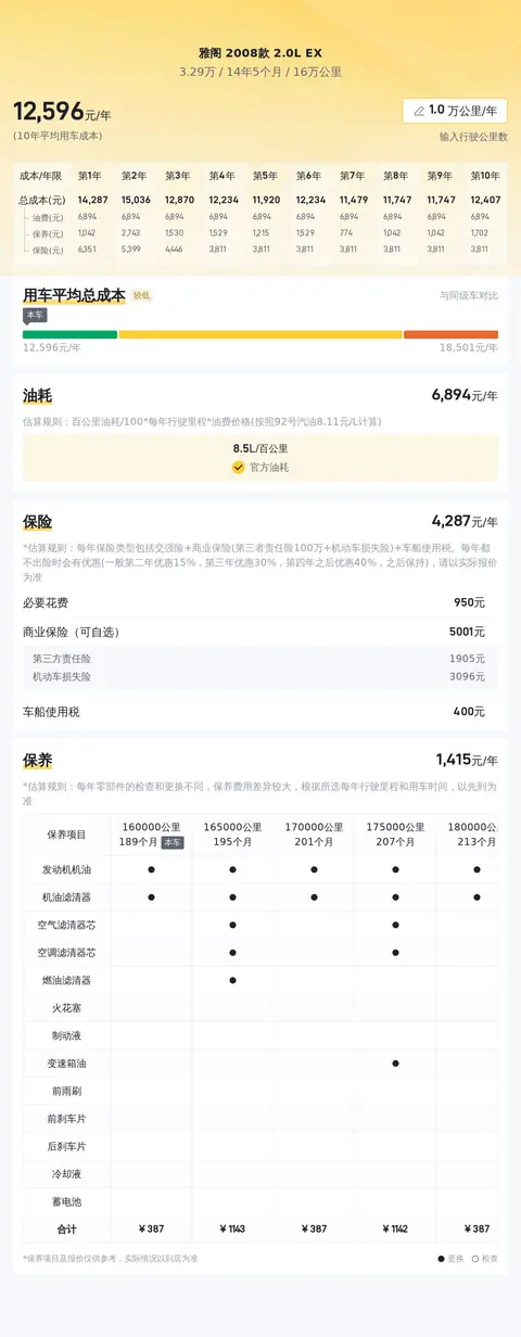 用车成本方面,按一年行驶一万公里计算,这款雅阁 2008款 2.0L EX的年均用车成本约为1.3万元,当然具体费用还是要根据车辆的实际使用情况而定。